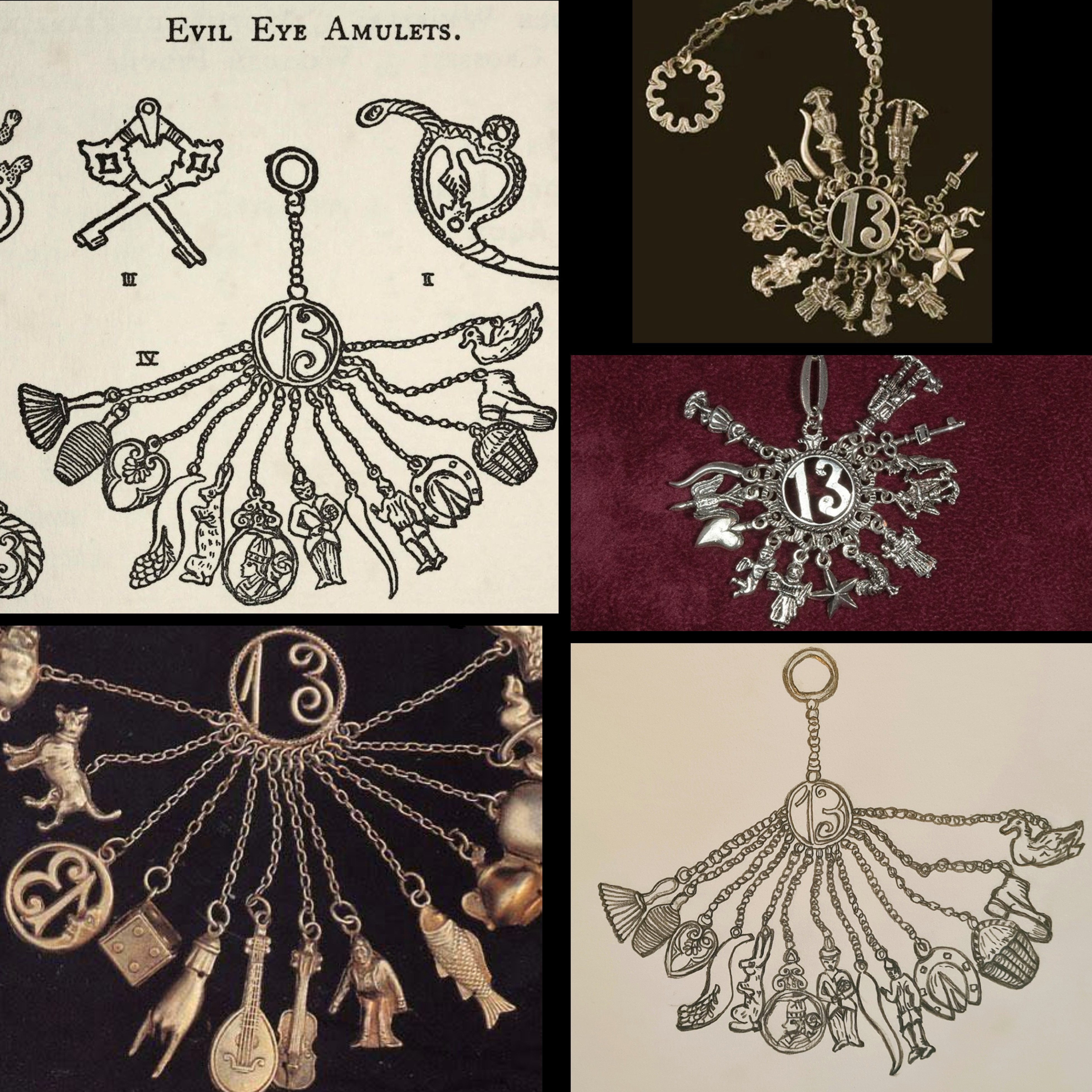 Top left is folklorist Estella Canziani’s sketch of such amulets when she visited Abruzzo in 1913. Top right, an amulet from the 1800s in Scanno, and below it, one currently in a Scanno jewellery shop, Oreficeria Di Rienzo. Bottom left – photographed in Pescara, 1996, by researchers, Adriana Gandolfi and Ezio Mattiocco. Bottom right – my drawing, 2026, inspired by Estella Canziani’s one 113 years ago.