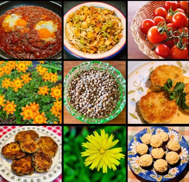 Spring circles in the kitchen and garden – eggs in purgatory, ‘lucky’ lentils, broad bean risotto fritters, a dandelion flower, melanzane fritte, orange patty cakes, fava spaghetti with spring greens…
