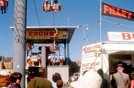 Looking closer at this old photo from the Brisbane Ekka (exhibition/show) that recently appeared on several local history sites, I couldn’t believe it when I happened to see my Dad in it. In 1971 he worked at the chairlift after he and Mum returned from travels and working overseas for a couple of years and he did other work until he resumed his teaching job. (Dad is one of the blokes in red and white and is under the OR of the Escort sign above).